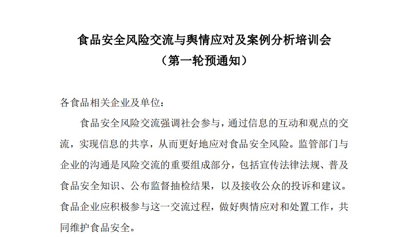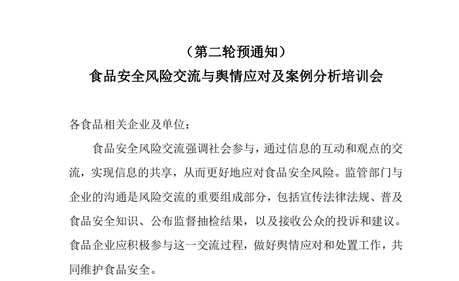 (第二輪預(yù)通知)食品安全風(fēng)險(xiǎn)交流與輿情應(yīng)對(duì)及案例分析培訓(xùn)會(huì)