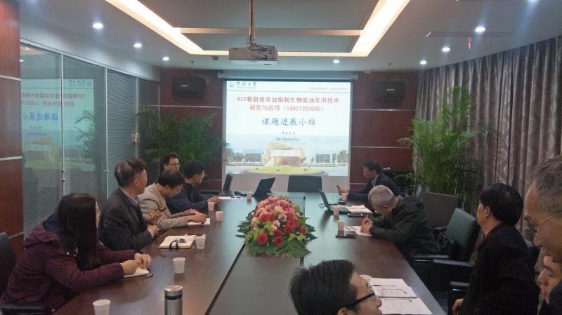 2017年11月17日下午,“B20餐廚廢棄油脂制生物柴油車用技術研究與應用”課題工作組召開例會。同濟大學、市食安聯、華誼集團研究院、巴士一公司、中器環保、石化產品質檢站、群欣市政公司等課題責任人和相關研究人員出席會議。