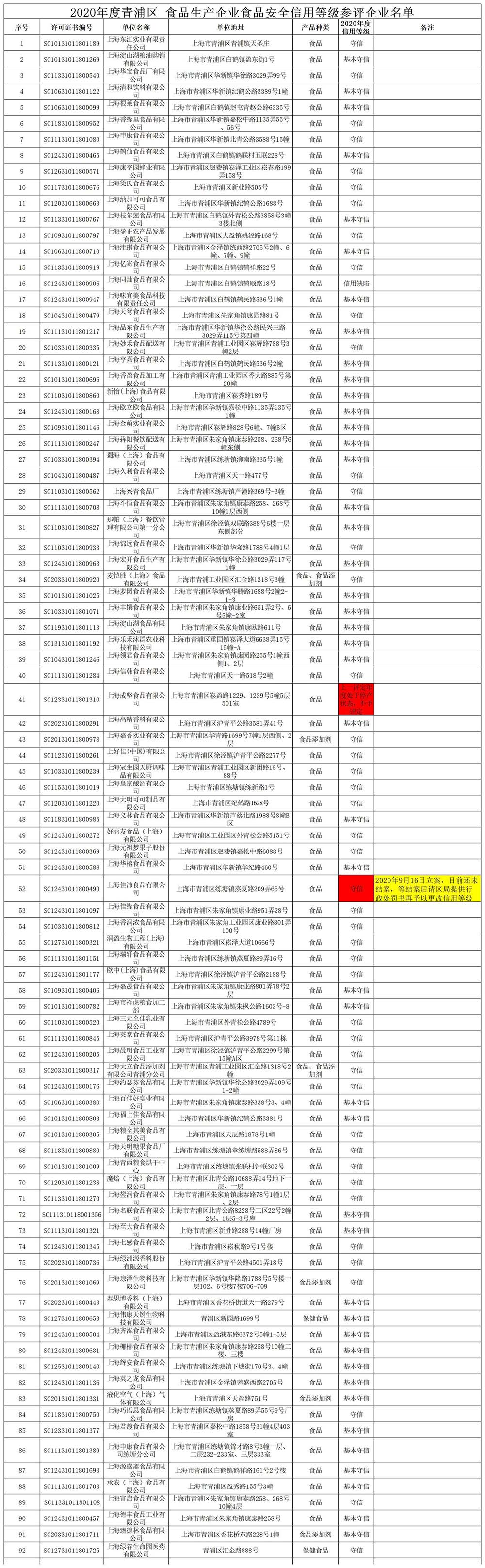 根據《上海市食品生產企業食品安全風險與信用分級監管辦法》的要求,經上海市食品安全工作聯合會組織相關專家,對2020年青浦區食品生產企業食品安全信用等級進行評定,現將評定結果公示如下: