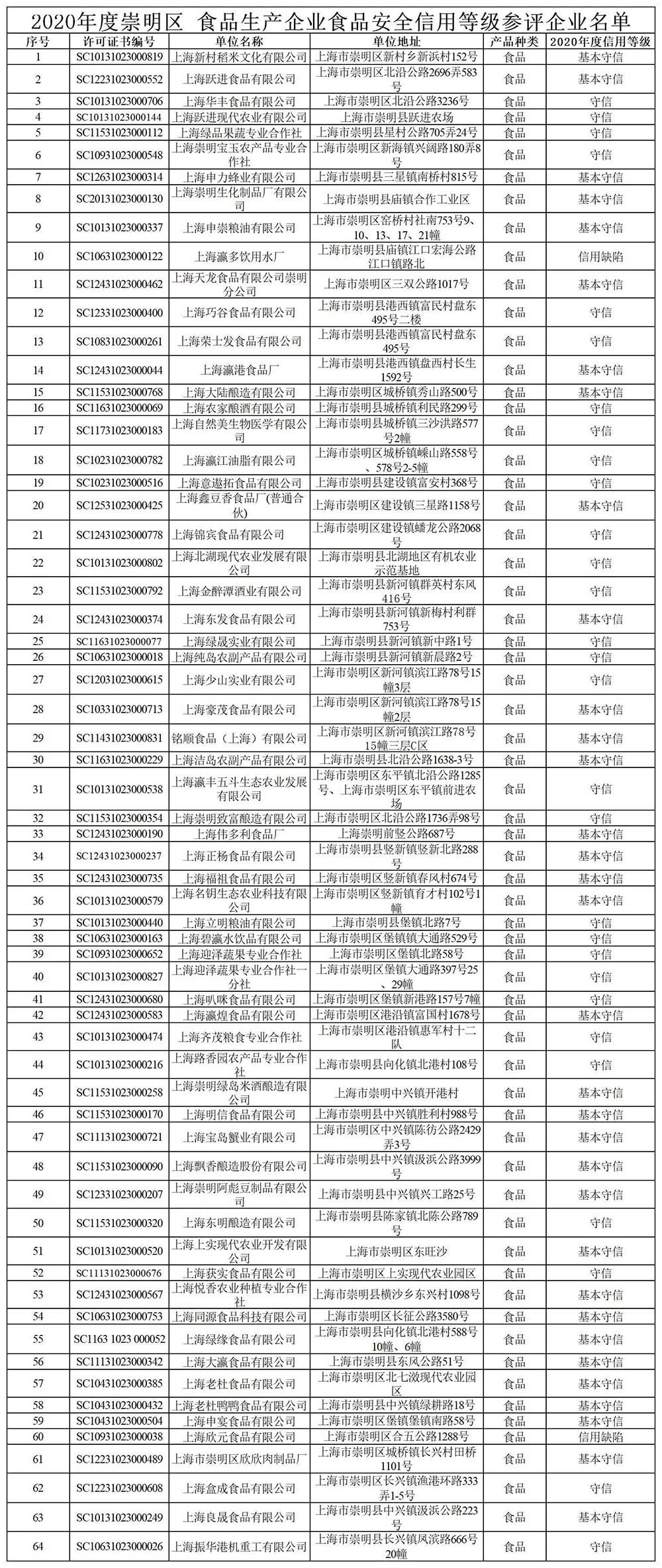 根據《上海市食品生產企業食品安全風險與信用分級監管辦法》的要求,經上海市食品安全工作聯合會組織相關專家,對2020年崇明區食品生產企業食品安全信用等級進行評定,現將評定結果公示如下: