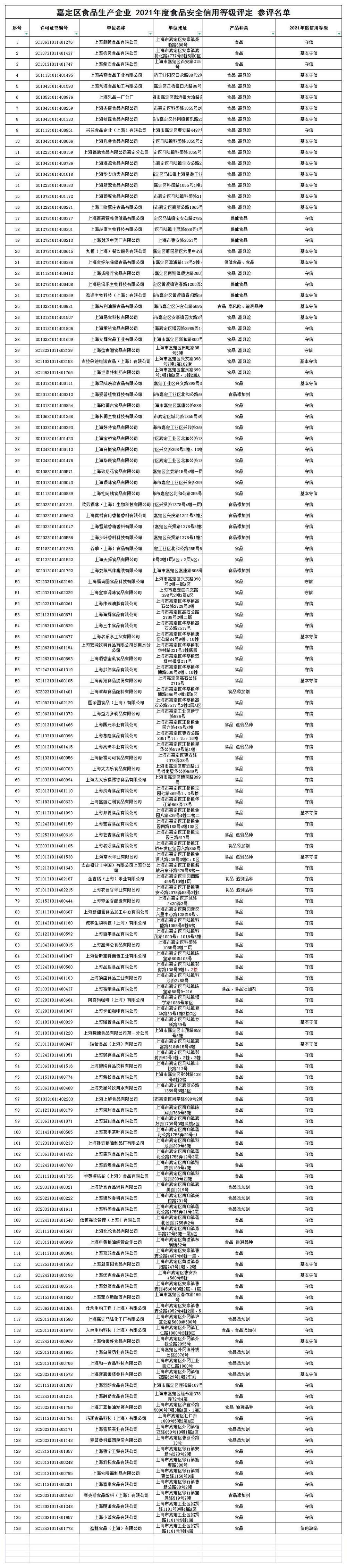 根據(jù)《上海市食品生產企業(yè)食品安全風險與信用分級監(jiān)管辦法》的要求,經上海市食品安全工作聯(lián)合會組織相關專家,對2021年嘉定區(qū)食品生產企業(yè)食品安全信用等級進行評定,現(xiàn)將評定結果公示如下: