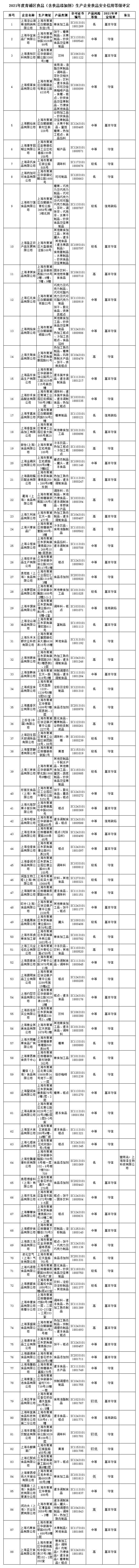 根據《上海市食品生產企業食品安全風險與信用分級監管辦法》的要求,經上海市食品安全工作聯合會組織相關專家,對2021年嘉定區食品生產企業食品安全信用等級進行評定,現將評定結果公示如下: